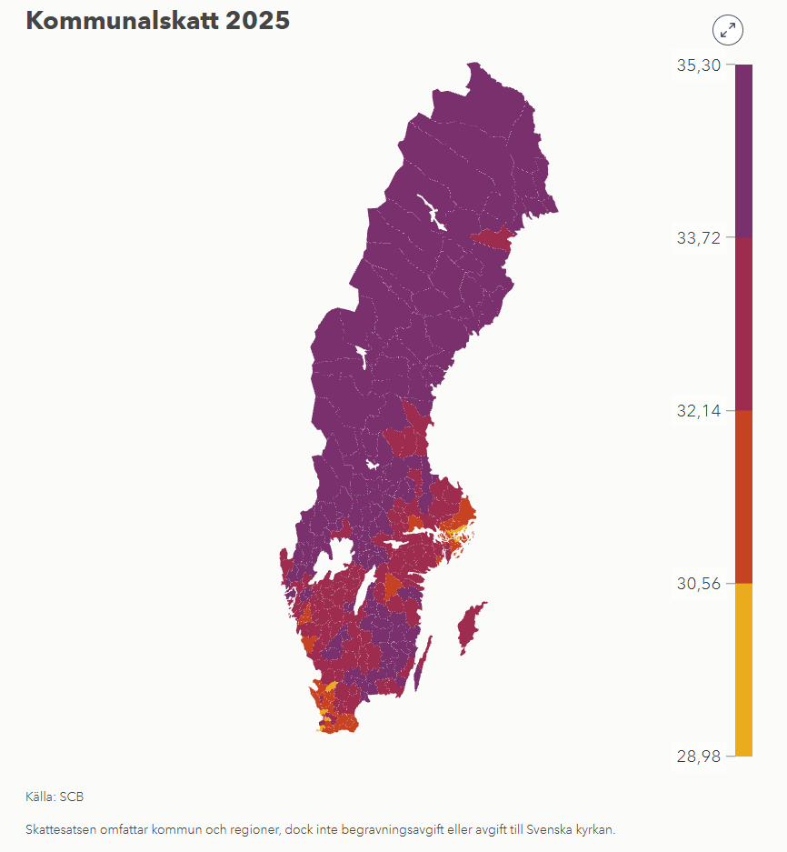 Högst är kommunalskatten i Degerfors där den 2025 når upp till 35,3 procent. Lägst är den i Österåker, där kommuninvånarna bara betalar 28,98 procent i skatt. Ekonomifakta har en komplett lista Läs mer i vår regionala statistik, där du kan söka reda på just din kommun.