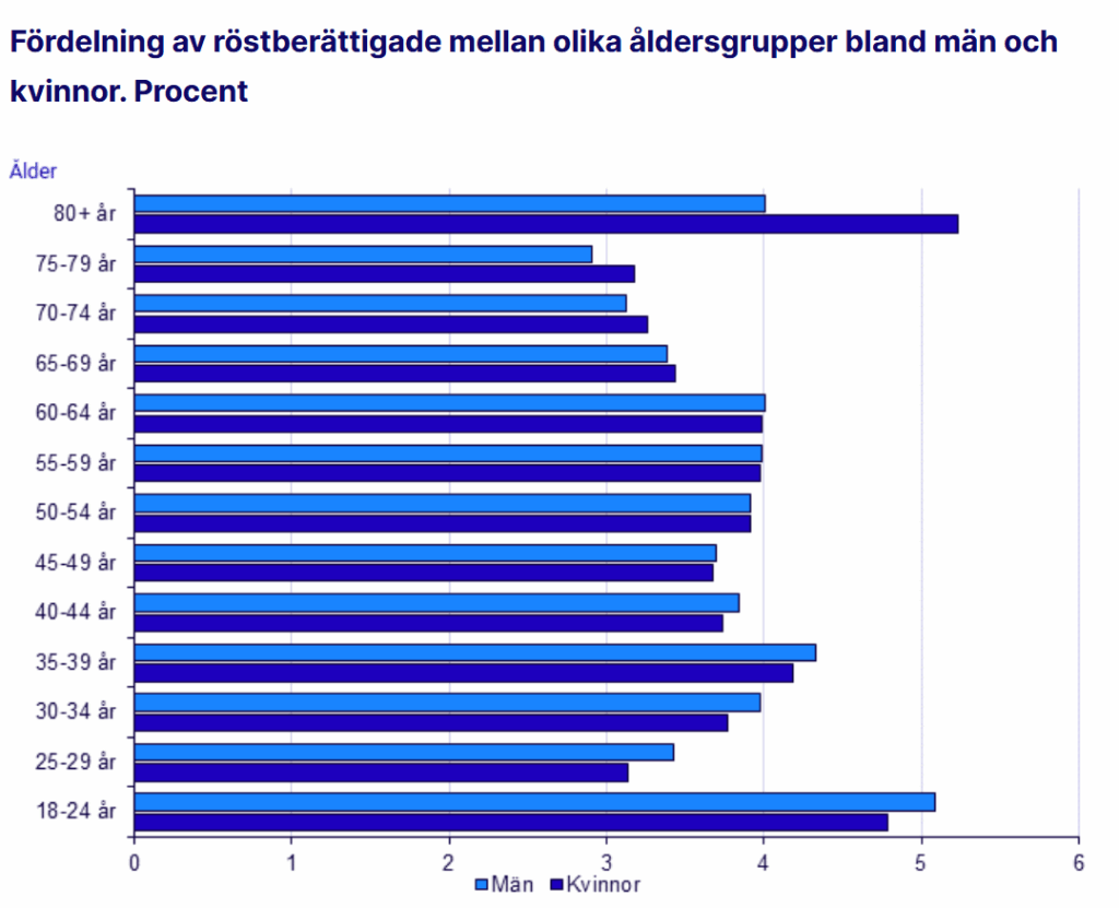 Sverige har en åldrande väljarkår. Det framgår av Statistiska Centralbyråns rapport om det preliminära antalet röstberättigade i riksdagsvalet 2026.