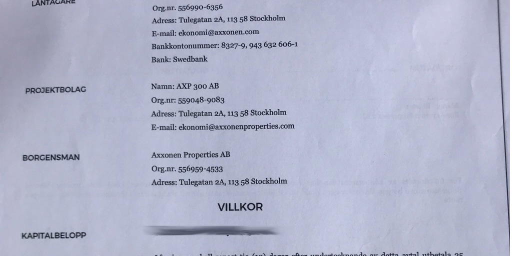 Axxonen-koncernen lånar in pengar till sina projekt på flera olika sätt. En modell är crowdfundingplattformen Tessin som matchar kapital och fastighetsprojekt. Genom åren har Tessin samlat in 50 miljoner kronor till Axxonen mot preferensaktier i moderbolaget. För det har aktieägarna blivit lovade 11 procent i årlig avkastning som betalats ut kvartalsvis. Den utdelningen är nu inställd.