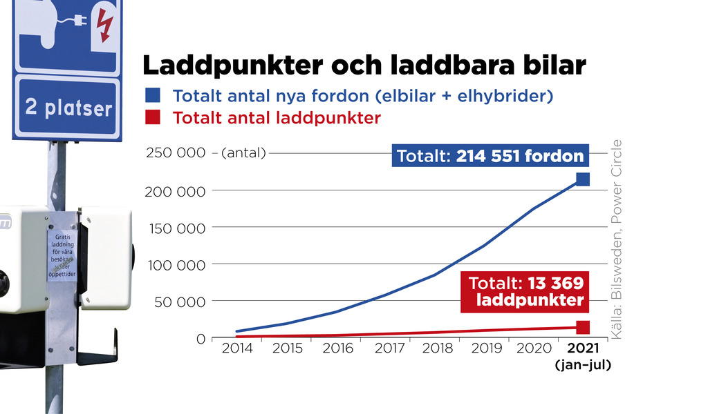 Samtidigt går det långsammare med utbyggnaden av laddstationer. Totalt finns omkring 13 000 publika laddpunkter, eller elbilsuttag, runt om i Sverige. Av dem räknas drygt 1 500 som snabbladdstationer.