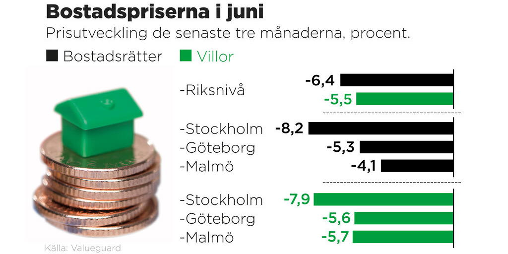 Priserna rasar på bostadsmarknaden, stor nedgång i juni. Störst tapp noteras i Stockholm – på tre månader har en bostadsrätt backat 8,2 procent.