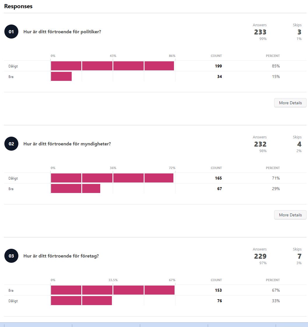 När det gäller förtroende för myndigheter har 71 procent av E55:s läsare uppgett att de har dåligt förtroende och 29 procent bra. Däremot ser siffran bättre ut avseende företag, där 67 procent av läsarna säger att de har ett bra förtroende och 33 procent dåligt.