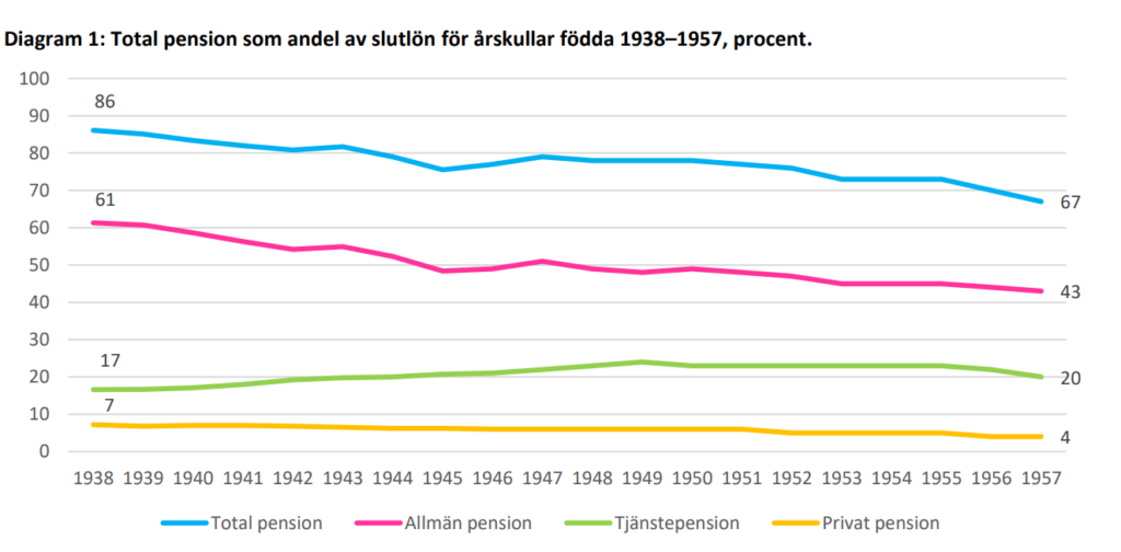 För svenskar födda 1960 ska deras pension räcka 15 procent längre än de som föddes 1935. Den allmänna pensionen motsvarar nämligen bara 43 procent av slutlönen. För 25 år sedan var siffran 56 procent.